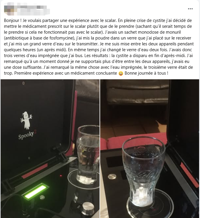 Bonjour ! Je voulais partager une expérience avec le scalar. En pleine crise de cystite j’ai décidé de mettre le médicament prescrit sur le scalar plutôt que de le prendre (sachant qu’il serait temps de le prendre si cela ne fonctionnait pas avec le scalar). J’avais un sachet monodose de monuril (antibiotique à base de fosfomycine), j’ai mis la poudre dans un verre que j’ai placé sur le receiver et j’ai mis un grand verre d’eau sur le transmitter. Je me suis mise entre les deux appareils pendant quelques heures (un après midi). En même temps j’ai changé le verre d’eau deux fois. J’avais donc trois verres d’eau imprégnée que j’ai bus. Les résultats : la cystite a disparu en fin d’après-midi. J’ai remarqué qu’à un moment donné je ne supportais plus d’être entre les deux appareils, j’avais eu une dose suffisante. J’ai remarqué la même chose avec l’eau imprégnée, le troisième verre était de trop. Première expérience avec un médicament concluante. Bonne journée à tous !