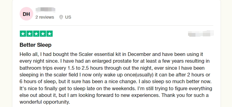 Hello all, I had bought the Scalar essential kit in December and have been using it every night since. I have had an enlarged prostate for at least a few years resulting in bathroom trips every 1.5 to 2.5 hours throughout the night, ever since I have been sleeping in the scaler field I now only wake up once(usually) it can be after 2 hours or 6 hours of sleep, but it sure has been a nice change. I also sleep so much better now. It’s nice to finally get to sleep late on the weekends. I’m still trying to figure everything else out about it, but I am looking forward to new experiences. Thank you for such a wonderful opportunity.