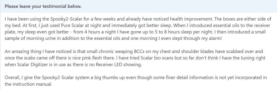 I have been using the Spooky2 Scalar for a few weeks and already have noticed health improvement. The boxes are on either side of my bed. At first, I just used Pure Scalar at night and immediately got better sleep. When I introduced essential oils to the receiver plate, my sleep even got better – from 4 hours a night I have gone up to 5 to 8 hours sleep per night. I then introduced a small sample of morning urine in addition to the essential oils and one morning I even slept through my alarm!