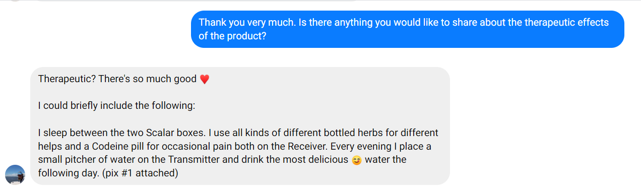 I sleep between the two Scalar boxes. I use all kinds of different bottled herbs for different helps and a Codeine pill for occasional pain both on the Receiver. Every evening I place a small pitcher of water on the Transmitter and drink the most delicious water the following day. (pix #1 attached)