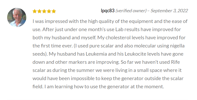 I was impressed with the high quality of the equipment and the ease of use. After just under one month’s use Lab results have improved for both my husband and myself. My cholesterol levels have improved for the first time ever. (I used pure scalar and also molecular using nigella seeds). My husband has Leukemia and his Leukocyte levels have gone down and other markers are improving. So far we haven’t used Rife Scalar as during the summer we were living in a small space where it would have been impossible to keep the generator outside the scalar field. I am learning how to use the generator at the moment.