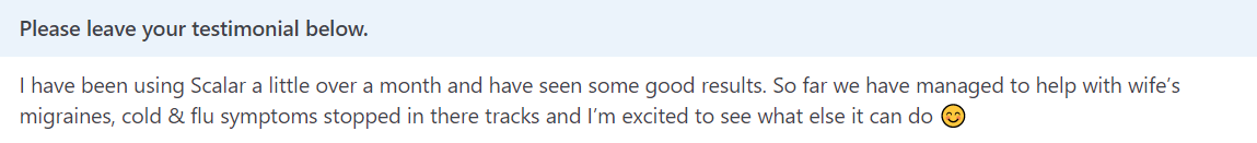 I have been using Scalar for a little over a month and have seen some good results. So far we have managed to help with my wife’s migraines, cold & flu symptoms stopped in their tracks and I’m excited to see what else it can do 😊