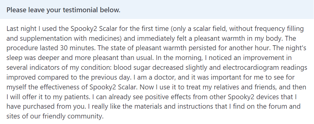 I am a doctor, and it was important for me to see for myself the effectiveness of Spooky2 Scalar. Now I use it to treat my relatives and friends, and then I will offer it to my patients. I can already see positive effects from other Spooky2 devices that I have purchased from you. I really like the materials and instructions that I find on the forum and sites of your friendly community.