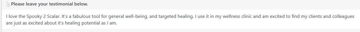 I love the Spooky 2 Scalar. It’s a fabulous tool for general well-being, and targeted healing. I use it in my wellness clinic and am excited to find my clients and colleagues are just as excited about it’s healing potential as I am.