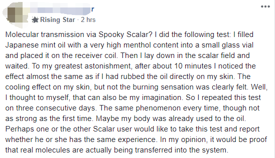 Molecular transmission via Spooky Scalar? I did the following test: I filled Japanese mint oil with a very high menthol content into a small glass vial and placed it on the receiver coil. Then I lay down in the scalar field and waited. To my greatest astonishment, after about 10 minutes I noticed the effect almost the same as if I had rubbed the oil directly on my skin. The cooling effect on my skin, but not the burning sensation was clearly felt. Well, I thought to myself, that can also be my imagination. So I repeated this test on three consecutive days. The same phenomenon every time, though not as strong as the first time. Maybe my body was already used to the oil. Perhaps one or the other Scalar user would like to take this test and report whether he or she has the same experience. In my opinion, it would be proof that real molecules are actually being transferred into the system.