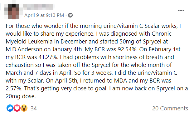 I was diagnosed with Chronic Myeloid Leukemia in December and started 50mg of Sprycel at M.D.Anderson on January 4th. My BCR was 92.54%. On February 1st my BCR was 41.27%. I had problems with shortness of breath and exhaustion so I was taken off the Sprycel for the whole month of March and 7 days in April. So for 3 weeks, I did the urine/vitamin C with my Scalar. On April 5th, I returned to MDA and my BCR was 2.57%. That’s getting very close to goal. I am now back on Sprycel on a 20mg dose.