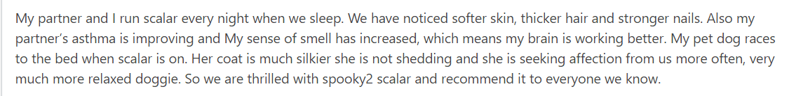 My partner and I run Scalar every night when we sleep. We have noticed softer skin, thicker hair and stronger nails. Also, my partner’s asthma is improving and my sense of smell has increased, which means my brain is working better. My pet dog races to the bed when Scalar is on. Her coat is much silkier she is not shedding and she is seeking affection from us more often, very much more relaxed doggie. So we are thrilled with Spooky2 Scalar and recommend it to everyone we know.