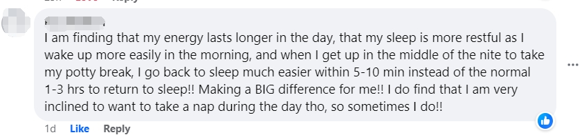 I am finding that my energy lasts longer in the day, that my sleep is more restful as I wake up more easily in the morning, and when I get up in the middle of the nite to take my potty break, I go back to sleep much easier within 5-10 min instead of the normal 1-3 hrs to return to sleep!! Making a BIG difference for me!! I do find that I am very inclined to want to take a nap during the day tho, so sometimes I do!!