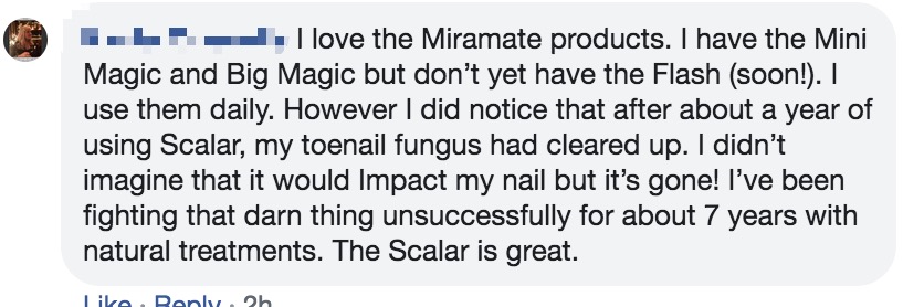 I love Miramate products. I have the Mini Magic and Big Magic but don’t yet have the Flash (soon!). I use them daily. However, I did notice that after about a year of using Scalar, my toenail fungus had cleared up. I didn’t imagine that it would Impact my nail but it’s gone! I’ve been fighting that darn thing unsuccessfully for about 7 years with natural treatments. The Scalar is great.
