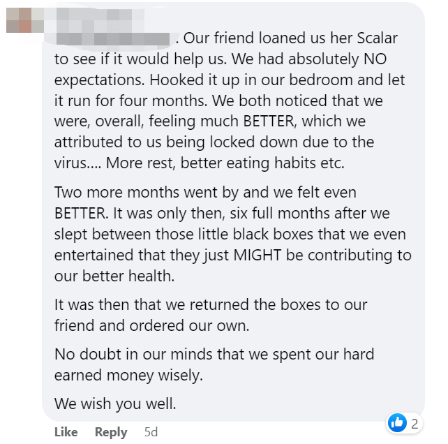 Our friend loaned us her Scalar to see if it would help us. We had absolutely NO expectations. Hooked it up in our bedroom and let it run for four months. We both noticed that we were, overall, feeling much BETTER, which we attributed to us being locked down due to the virus. More rest, better eating habits, etc.