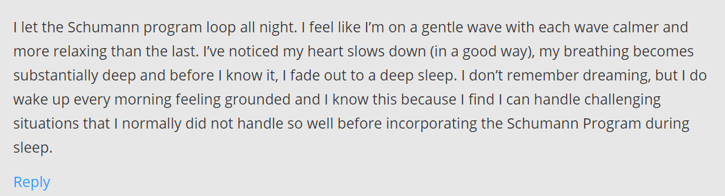 I let the Schumann program loop all night. I feel like I’m on a gentle wave with each wave calmer and more relaxing than the last. I’ve noticed my heart slows down (in a good way), my breathing becomes substantially deep and before I know it, I fade out to a deep-sleep. I don’t remember dreaming, but I do wake up every morning feeling grounded and I know this because I find I can handle challenging situations that I normally did not handle so well before incorporating the Schumann Program during sleep.