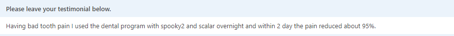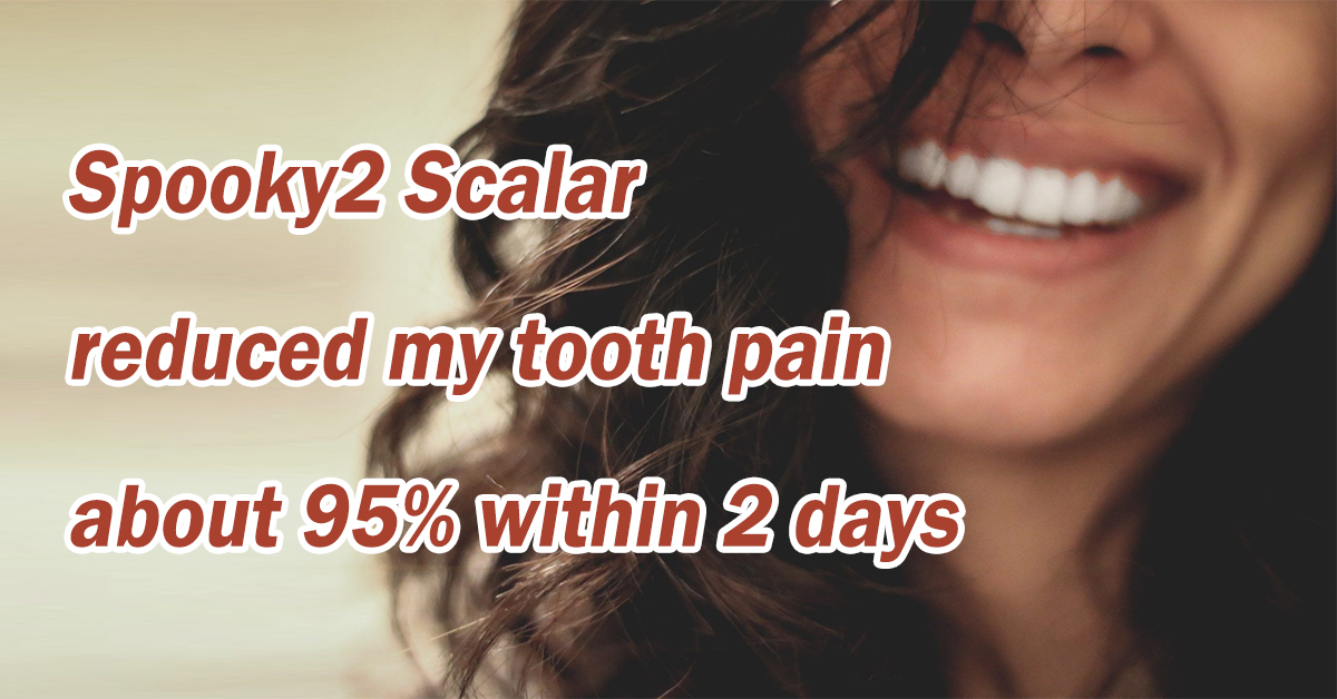 Spooky2 Scalar reduced my tooth pain about 95% within 2 days By scalarreviews | December 11, 2020 2 Comments Having bad tooth pain I used the dental program with Spooky2 Scalar overnight and within 2 days the pain reduced about 95%.