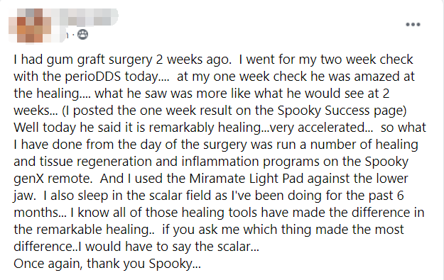 I had gum graft surgery 2 weeks ago. I went for my two-week check with the periods today. At my one-week check, he was amazed at the healing. What he saw was more like what he would see at 2 weeks. (I posted the one-week result on the Spooky2 Success page.)